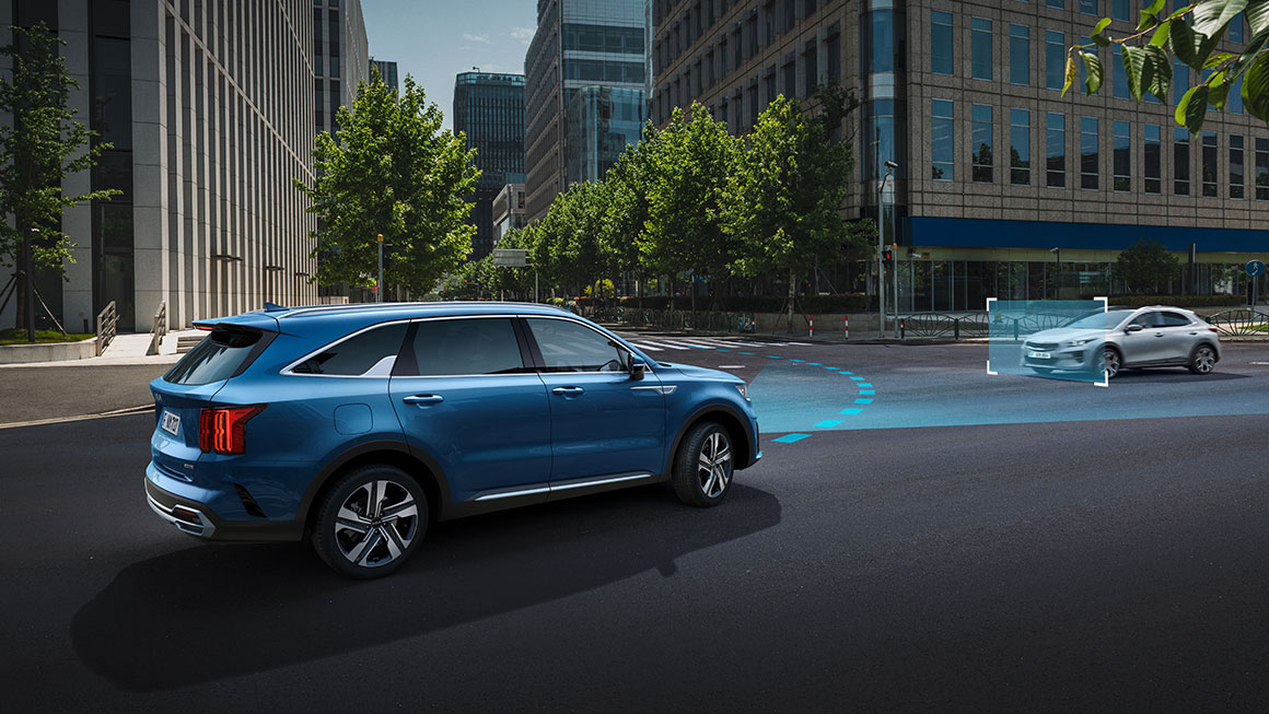 Bei niedrigen Geschwindigkeiten warnt das System vor potenziellen Kollisionsrisiken, die von Objekten in der Nähe ausgehen. Vorne und hinten verfügt der Sorento über Sensoren, die auch die Seiten im Blick haben und so für eine 360-Grad-Abdeckung sorgen.